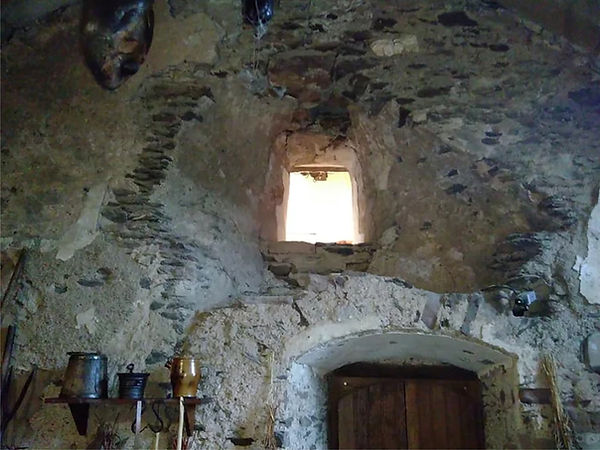 A huge chimney (reconstructed only unto the 2nd storey) covered a fireplace of approximately 20 x 13 feet (6 x 4 metres). The furnace visible inside the wall also made use of this chimney.