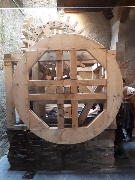 In 2016 the well hoist mechanism was reconstructed, which was made possible by detailled information found inside the castle accounts and research about hoist mechanisms. The structure looks amazingly huge and quasi industrial; one doesn't necessarily expect such a thing at a castle. But to remember: There was need to provide the whole castle with water; the daily need would have been around 800 litres / 180 gallons - the quantity fitting into the stone basins which stood here and taking around an hour of work for two men to lift up ...